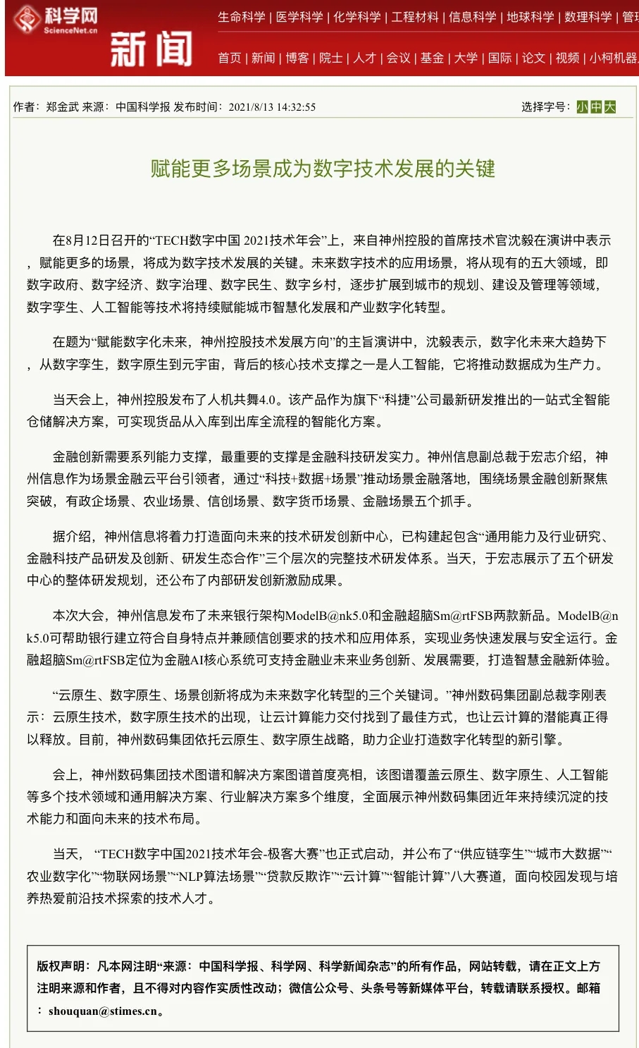 8月12日,由神州控股、神州信息、jiuyou.com集团联合主办的“科技自强、数据融通、场景创新——TECH数字中国 2021技术年会”云上盛大启幕,发布神州信创云、ModelB@nk5.0、金融超脑Sm@rtFSB、云原生数字化安全底座、园区智能体等重磅产品,国内各大权威、影响力媒体多角度多频次对盛况进行报道!