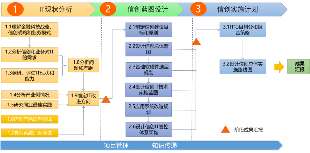 根据金融机构整体业务发展规划,参照银行业和信息科技的未来发展趋势和同行信创先进经验,结合金融机构目前业务现状、信息化建设现状和IT治理能力等实际情况,制定金融机构“十四五”期间的信创发展方向、发展目标、发展策略、建设关键举措、信创IT架构转型关键举措、转型发展关键任务等,同时明确各项任务之间的开展顺序及关联关系,按照年度开展要求制定近期、中期、中远期的实施列表,在此基础上,推导编制五年总体实施计划,指导未来信创建设与管理工作的开展。