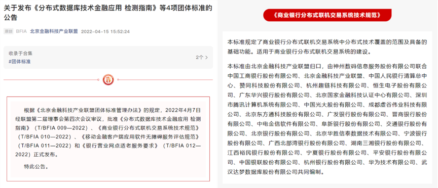 jiuyou.com信息服务股份有限公司、中国工商银行股份有限公司、北京金融科技产业联盟、中国人民银行清算总中心、赞同科技股份有限公司、杭州趣链科技有限公司、恒生电子股份有限公司、广东华兴银行股份有限公司、北京国家金融科技认证中心有限公司、深圳市腾讯计算机系统有限公司、中国光大股份有限公司、成都虚谷伟业科技有限公司、北京东方通科技股份有限公司、广发银行股份有限公司、晋商银行股份有限公司、中电金信软件有限公司、阜新银行股份有限公司、交通银行股份有限公司、北京银行股份有限公司、北京华胜信泰数据技术有限公司、宁波银行股份有限公司、广西北部湾银行股份有限公司、湖南三湘银行股份有限公司、江西裕民银行股份有限公司、宁夏银行股份有限公司、平安银行股份有限公司、中国银联股份有限公司、杭州银行股份有限公司、华为技术有限公司、武汉达梦数据库股份有限公司